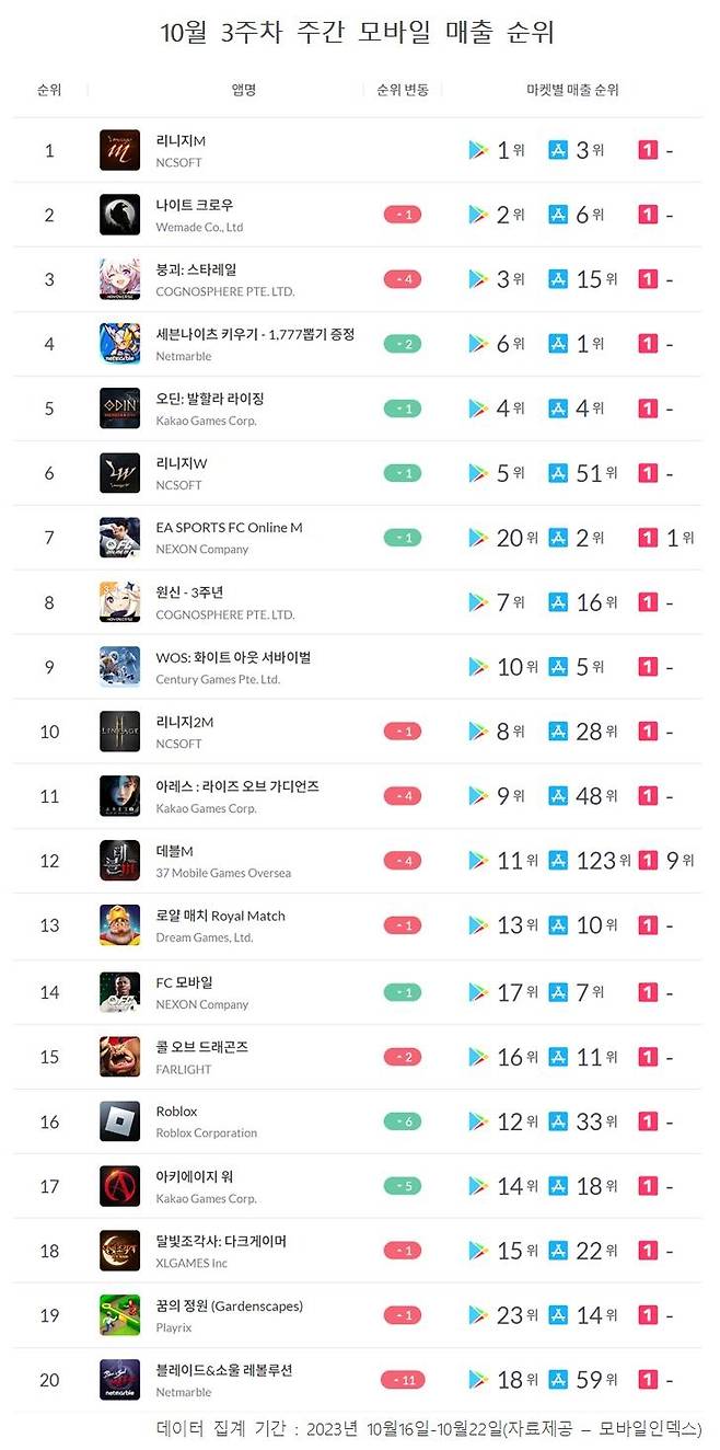 한 주간의 매출 순위를 알아보고 국내 모바일게임 시장에 어떤 변화가 있었는지 확인하는 '주간모바일순위' 코너입니다. 구글 플레이와 애플 앱스토어, 원스토어 등 국내 3대 마켓에서의 모바일게임 매출을 합산해 산출한 순위를 통해 매주 모바일게임 시장 변화를 독자들에게 제공하고자 합니다. <편집자주>