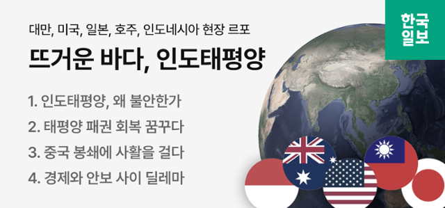 인도태평양은 전 세계 인구의 65%, 국내총생산(GDP)의 60%를 차지한다. 이 드넓은 바다가 달아오르고 있다. 미국과 일본이 앞장선 중국 견제에 각국이 동참하면서 치열한 외교전과 일촉즉발의 군사행동이 한창이다. 윤석열 정부도 인도태평양 전략을 외교 독트린으로 내세워 대열에 가세했다. 한국일보는 대만 미국 일본 호주 인도네시아 현장을 찾아 저마다의 인도태평양 전략을 살펴보고 4회에 걸쳐 연재한다.