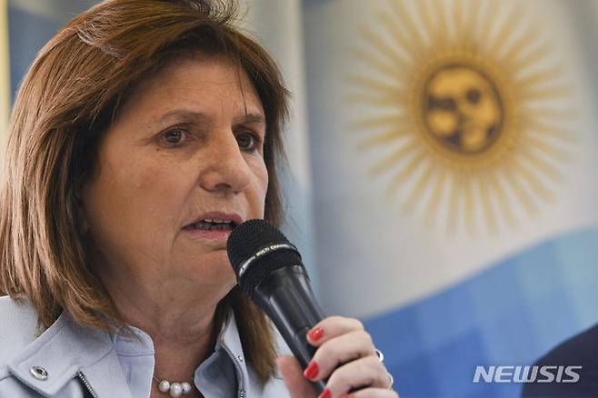 [부에노스아이레스=AP/뉴시스] 아르헨티나 대통령 선거에서 3위를 차지해 결선 투표 진출에 실패한 야권 후보 파트리시아 불리치(67)가 극우파 하비에르 밀레이(53) 후보 지지를 전격 선었했다. 사진은 불리치가 25일(현지시간) 아르헨티나 수도 부에노스아이레스에서 기자회견을 하는 모습. 2023.10.26.