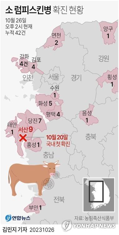 (서울=연합뉴스) 김민지 기자 = 국내에서 가축전염병인 럼피스킨병이 발생한 지 일주일째인 26일 확진 사례가 40건을 넘었다. 럼피스킨병 중앙사고수습본부(중수본)는 26일 오후 2시 기준 확진 사례가 모두 42건으로 집계됐다고 밝혔다.