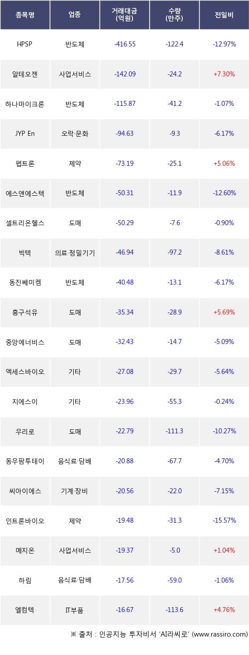 외국인 투자자의 순매도 상위 20개 종목은 HPSP, 알테오젠, 하나마이크론, JYP Ent., 펩트론, 에스앤에스텍, 셀트리온헬스케어, 빅텍, 동진쎄미켐, 흥구석유등이다.