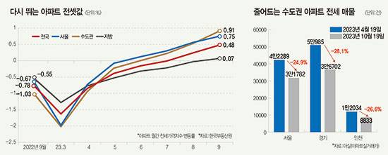 전셋값이 상승세로 반전한 것은 수요는 늘어나는 데 반해 공급이 줄어드는 점도 영향을 미쳤다. 부동산 빅데이터 플랫폼 ‘아실(아파트실거래가)’에 따르면 10월 아파트 전세 매물은 6개월 전에 비해 4분의 1가량 줄어들었다. 10월 19일 기준 서울 아파트 전세 매물은 3만1782건으로, 6개월 전인 4월 19일(4만2289건)에 비해 24.9% 감소했다. 같은 기간 경기와 인천 지역 매물은 각각 28.1%, 26.6%씩 줄어 3만6702건, 8833건에 그쳤다.