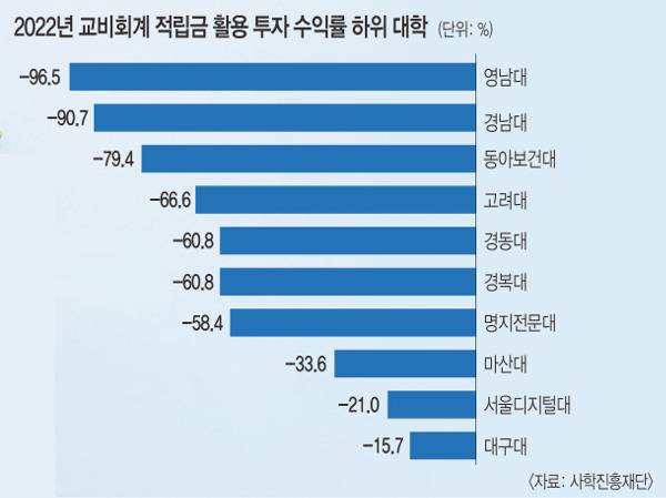 대학별로 보면 영남대는 96.5% 평가손실(5억2000만원)을 입어 2019년 이후 4년 연속 최하위에 머물렀다. 영남대는 2007년 투자한 채권형 펀드의 투자 기업이 법정관리에 들어감에 따라 평가손실이 발생했다. 경남대(-90.7%·19억6000만원), 동아보건대(-79.4%·11억2000만원), 고려대(-66.6%·4000만원), 경동대(-60.8%·21억3000만원), 경복대(-60.8%·55억7000만원), 명지전문대(-58.4%·124억4000만원)가 뒤를 이었다.