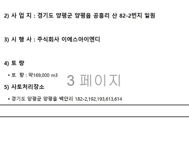 | ▲ 최은순씨 가족회사인 이에스아이엔디가 양평군에 제출한 '양평공흥지구 도시개발사업 공동주택 신축공사 토사반출계획서' 중 일부. 이에스아이엔디는 당초 사토처리장소로 백안리 192번지 외 4개 필지를 신고했다. |