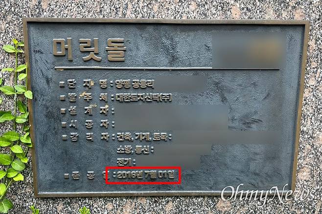 | ▲ 양평공흥지구 개발 사업으로 들어선 아파트 입구에 있는 머릿돌. 준공일은 2016년 7월 1일로 새겨져 있다. |