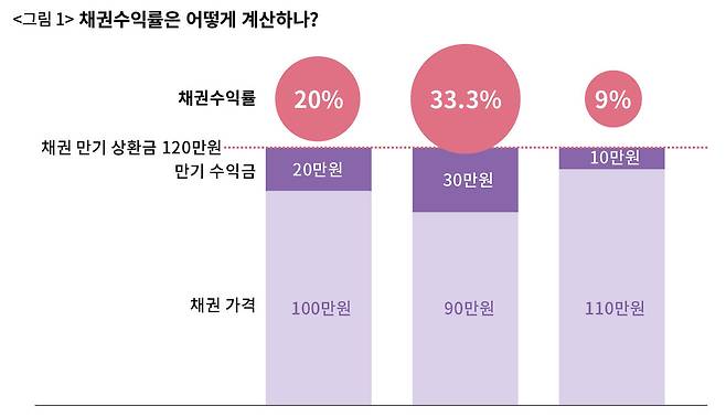 간단한 사례로 살펴보자. 어떤 기업이 ‘100만원을 빌려주면 1년 뒤에 120만원(만기 상환금)’을 돌려주는 조건으로 회사채를 발행했다. 이 회사채를 100만원의 가격으로 사면(=해당 기업에 100만원을 빌려주면), ‘1년 뒤에 120만원을 돌려받을 권리’를 갖게 된다. 100만원 투자해서 20만원의 수익을 올리게 되므로 채권수익률은 20%다(〈그림 1〉 참조). 이 회사는 상반기에 큰 수익을 올렸다. 빌린 돈을 갚지 못할 위험이 작아졌다. 이 회사채를 갖고 싶은 사람이 늘어나면서 채권 가격이 110만원으로 올랐다. 해당 채권을 110만원에 매입한 투자자는 만기일에 10만원의 수익을 올리게 된다. 채권수익률은 약 9%(10만원/110만원×100)다. 하반기 접어들면서 회사 실적이 악화되었다. ‘미상환 리스크’가 커졌다. 그대로 갖고 있다간 돈을 돌려받지 못할 수 있다. 이 회사채를 팔려는 사람이 많아지면서 채권 가격이 90만원으로 떨어졌다. 모험을 즐기는 투자자가 이 회사채를 90만원에 매입하면 만기에 30만원의 차액(120만원-90만원)을 건질 수 있으므로 채권수익률은 약 33.3%(30만원/90만원×100)로 급등한다. 물론 이 업체가 망하지 않는 경우다.