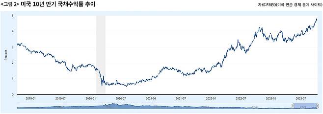 7월 말, 미국 10년물 수익률이 4%를 넘어섰다. 최근(10월 상반기)에는 4.5~4.9% 사이를 오르내리고 있다. 지난 글로벌 금융위기 이후 가장 높은 수치다. 3%대 초반에 들어선 것이 올해 봄이었다. 9월에만 0.7%포인트가량 올랐다.