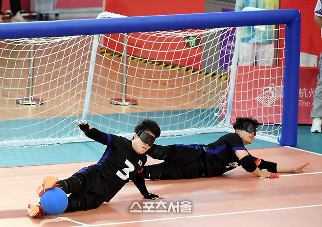 남자골볼 손원진이 27일 항저우에 위치한 중국 골볼 전용구장에서 열린 2022 항저우 장애인아시아경기대회 이란과 동메달 결정전에서 공을 막아내고 있다.