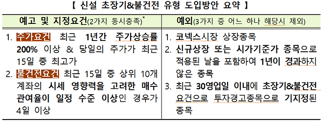 다만 코넥스 시장 종목, 거래 개시일을 포함해 1년이 지나지 않은 신규 상장 종목, 최근 30영업일 이내에 초장기·불건전 요건을 충족해 투자경고 종목으로 이미 지정된 종목은 적용 대상에서 제외됩니다.