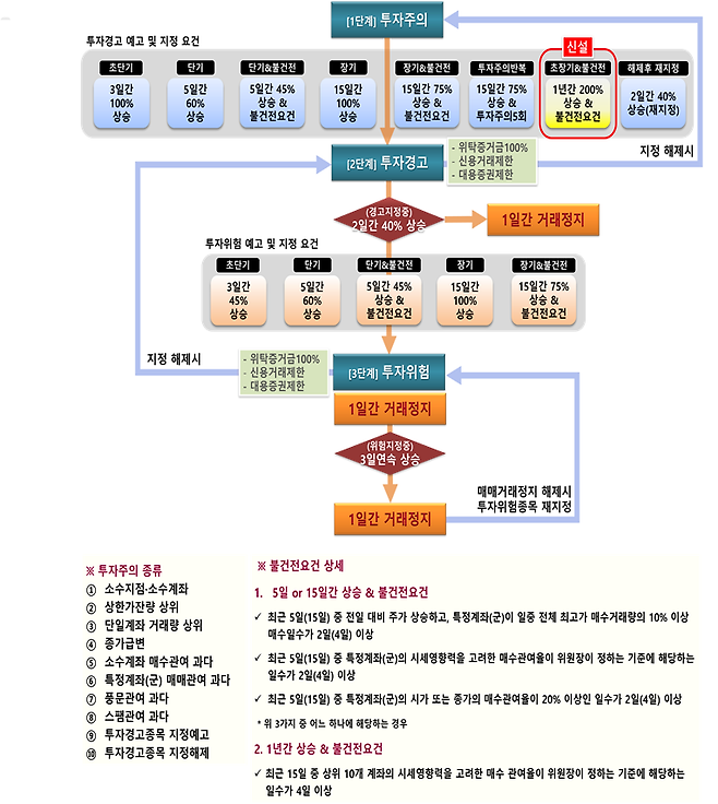 오늘(27일) 한국거래소에 따르면 투자주의·투자경고·투자위험의 3단계로 이뤄진 시장경보제도에서 '투자경고' 종목의 신규 유형으로 '초장기 불건전 유형'이 도입됩니다. 통상 투자경고·위험 종목으로 지정되면 매매거래 정지가 가능하며, 위탁증거금 100% 징수와 신용거래 제한 등의 추가 조치가 시행될 수 있습니다.