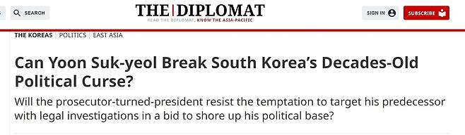 24일(현지시간) 미 외교 전문지 <디플로매트(The Diplomat)>는 '윤석열 대통령은 한국의 수십 년 된 정치적 저주를 끊을 수 있을까'(Can Yoon Suk-yeol Break South Korea's Decades-Old Political Curse?)라는 제목의 칼럼을 보도했다. 기사는 제이슨 모건 레이타쿠 대학 교수가 작성했다.