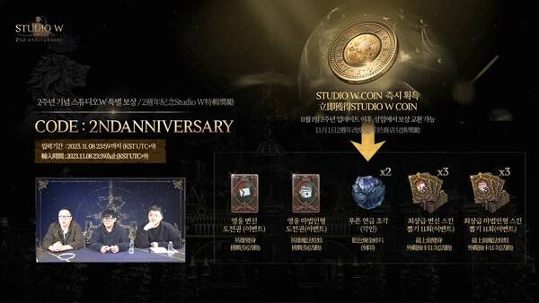 스페셜 쿠폰은 영웅 변신 도전권, 영웅 마법인형 도전권, 푸른 연급 조각 2개, 최상급 변신 스킨 뽑기 11회 3개, 최상급 마법인형 스킨 뽑기 11회 3개으로 구성됐다. 11월 1일 업데이트 이후 스튜디오 W 코인으로 보상을 교환할 수 있다.