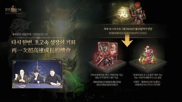 안타라스 업데이트 당시 제공했던 75레벨 성장 혜택을 다시 제공한다. 축복 부스터 프로그램은 내년 1월 10일까지 연장되며 시작과 함께 영웅 등급 변신 및 마법인형, 무기 및 방어구 세트를 받을 수 있다. 신규 유저도 해당 혜택을 통해 75레벨까지 고속 성장을 노려볼 만하다.