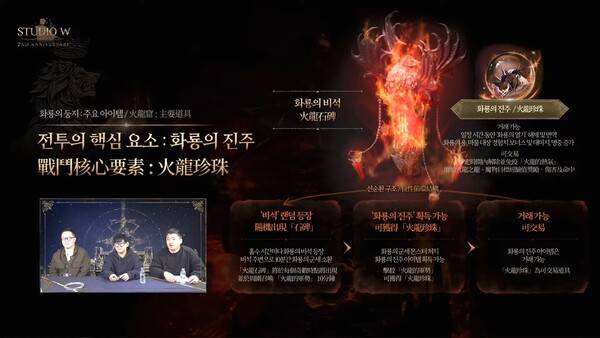 최 실장은 "홀수 시간마다 화룡의 비석이 등장하면 비석 주변으로 10분 동안 화룡의 군세가 소환된다. 화룡의 군세 몬스터를 처치하면 화룡의 진주 아이템을 획득할 수 있다. 화룡의 진주는 거래 가능한 아이템이다. 다이아를 수급하거나 상위 아이템을 만드는 재료로 사용할 수 있다"고 설명했다.