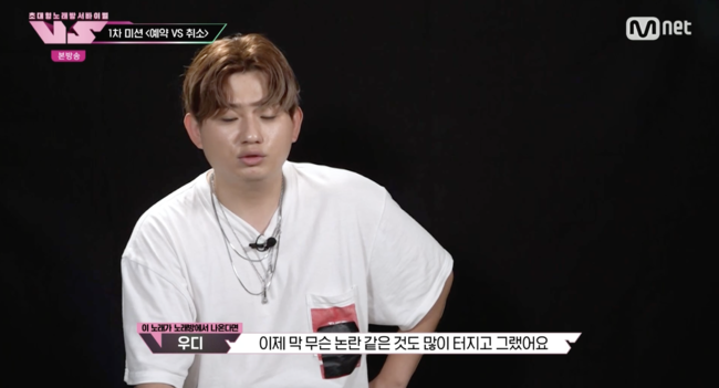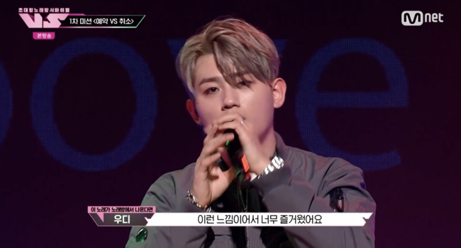 우디는 27일 방송된 Mnet 초대형 노래방 서바이벌 ‘VS(브이에스)’에 참가자로 등장했다. ‘이 노래가 노래방에서 나온다면’이라는 이름표를 붙이고 있던 그는 자신의 노래이자 음원 사재기 의혹을 받았던 ‘이 노래가 클럽에서 나온다면’을 선곡해 눈길을 끌었다.