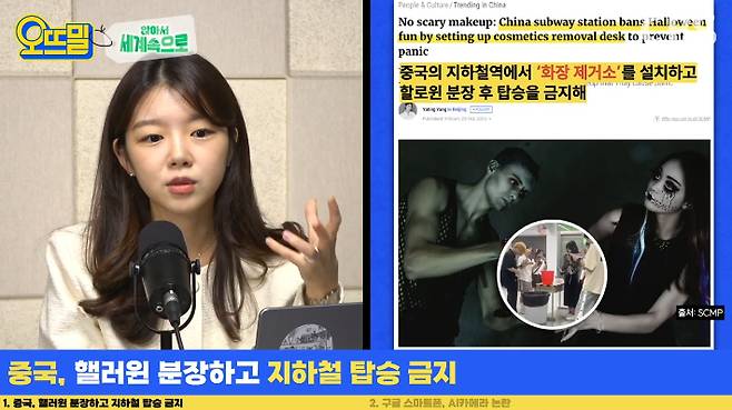 ◆ 박수정> 저도 깜짝깜짝 놀랐던 기억이 있는데요. 오늘은 중국의 기사를 하나 소개해볼까 합니다. 중국의 한 지자체에서 핼러윈 분장을 하고 지하철에 탑승하는 것을 금지해서 화제가 됐습니다. 홍콩의 대표 언론사인 <사우스차이나 모닝포스트>의 보도에 따르면 중국의 광저우시에서 핼러윈 데이를 맞이해서 각종 행사가 예정되어 있대요. 그런데 다들 아시다시피 핼러윈엔 피 분장, 상처 분장, 귀신 분장, 좀비 분장하잖아요. 이런 분장을 한 채로 지하철에 탑승하면 안 된다고 합니다.