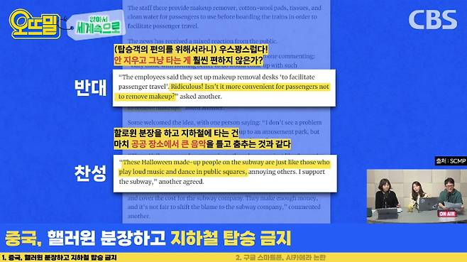 또 이 정책에 찬성하는 측에서는 '이상하고 무서운 분장을 하고 지하철에 타는 건 마치 공공장소에서 큰 음악을 틀고 춤을 추는 것과 같다.' 실제로 우리나라 지하철 타면 음악 틀고 춤추시는 분들이 있잖아요. 마치 그것처럼 옆 사람에게 피해를 주는 행동이라고 하는데요. 둘 다 좀 일리가 있다 싶으면서 여러분들의 의견이 좀 궁금합니다.