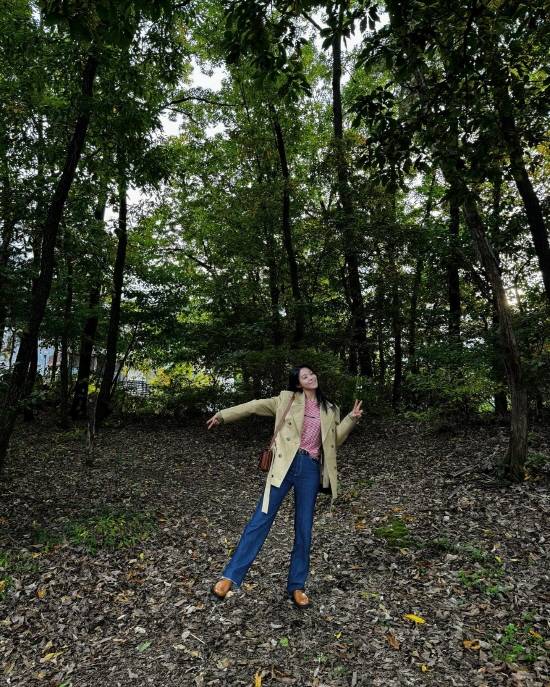 그런가 하면 산길로 보이는 곳에서 낙엽을 밟으며 다양한 포즈를 취하기도 했다. 작은 얼굴과 큰 키로 남다른 비율을 뽐냈다.