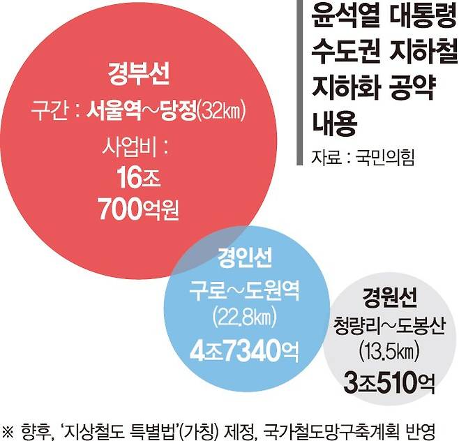 이는 윤석열 대통령이 지난 대선 후보시절 공약한 철도 지하화를 이행하기 위한 행보다. 윤 대통령은 경부선 서울역~당정 구간(32㎞), 경원선 청량리~도봉산 구간(13.5㎞), 경인선 구로~도원역 구간(22.8㎞) 철도 지하화를 공약한 바 있다. 국민의힘 선대본부는 당시 지하화 사업에 따라 23조8550억원의 천문학적 예산이 소요될 것으로 추산했다. 경부선 16조700억원, 경인선 4조7340억원, 경원선 3조510억원이다. 철도 지하화 사업은 그동안 선거철이면 여야 정치권에서 내걸던 공약이었지만, 천문학적 재원 마련과 낮은 경제성(B/C) 등으로 무산되기도 했다.