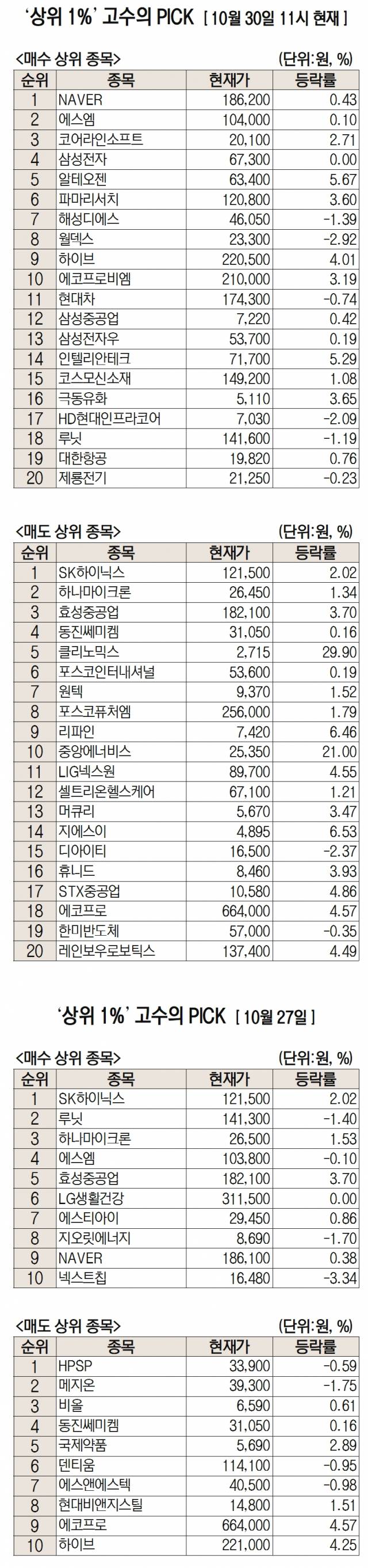이날 미래에셋엠클럽에 따르면 미래에셋증권 주식 거래 고객 중 최근 1개월 간 투자수익률 상위 1%에 해당하는 ‘주식 초고수’들이 오전 11시까지 가장 많이 사들인 종목은 네이버로 집계됐다.