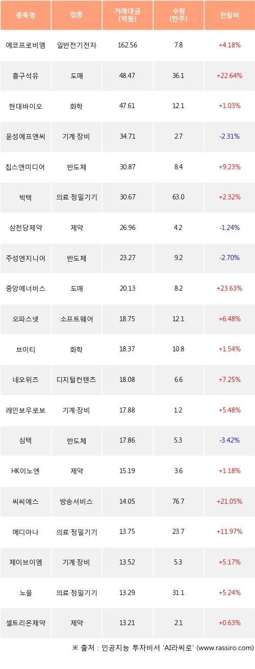 에코프로비엠, 흥구석유, 현대바이오 등은 전일 대비 주가가 상승했고, 윤성에프앤씨, 삼천당제약, 주성엔지니어링 등은 주가가 하락했다.