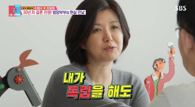 그때 진양혜는 "긍정적으로 느껴지는 게 '손범수 씨가 생활을 스스로 잘 할 수 있겠구나. 나도 독립을 해도 괜찮겠다'고 생각을 했다"며 독립 선언을 했다. 그는 "나이가 50이 넘고 생각해보니까 제가 우선 순위 1번이었던 적이 없다. 늘 남편, 아이들 우선이었다. 정신적으로 독립하겠다는 뜻이다"고 했다. 이에 손범수는 "홀로서기? 같이 서자"고 해 진양혜를 웃게 했다.