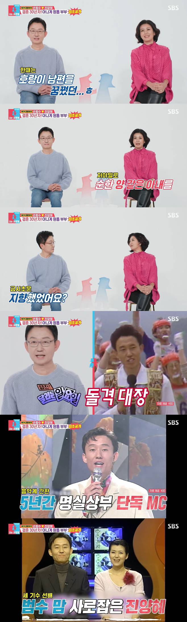 손범수는 "진양혜 씨의 호랑이 남편 손범수다. 호랑이 '범'은 아니지만 한 때는 호랑이 남편을 꿈꿨다. 지금은 아니겠지만. 현실은 정반대다"며 "제가 점점 양이 되어 가고 순한 양이 이미 됐다"고 소개했다. 진양혜는 "손범수 씨의 양 같은 아내 진양혜다"며 "순한 양 같은 아내를 늘 지향하고 있다"며 웃었다. 그러자 손범수는 "늘 지향했었냐. 30년 동안 못 느꼈다"고 해 웃음을 자아냈다.