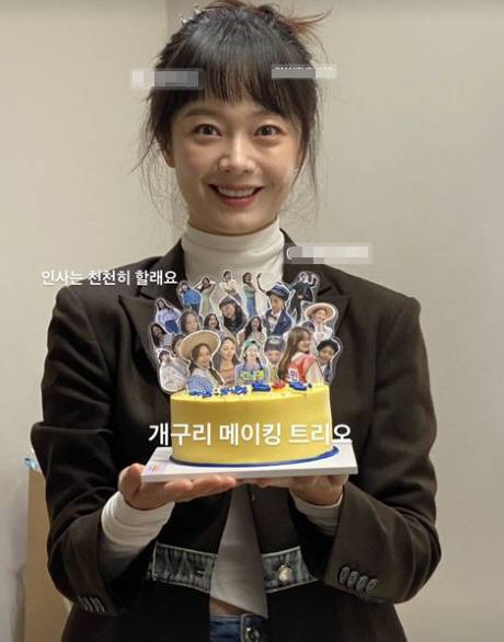31일 전소민은 "인사는 천천히 할래요"라면서 '런닝맨' 속 그의 캐릭터가 가득 담긴 케이크를 두 손에 들었다.