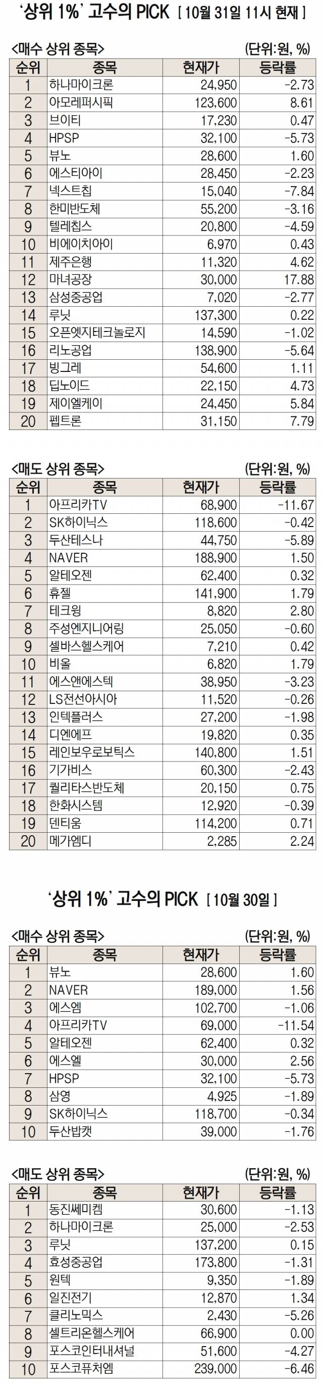 이날 미래에셋엠클럽에 따르면 미래에셋증권 주식 거래 고객 중 최근 1개월 간 투자수익률 상위 1%에 해당하는 ‘주식 초고수’들이 오전 11시까지 가장 많이 사들인 종목은 하나마이크론로 집계됐다.