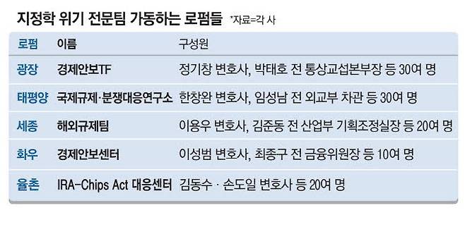 광장과 태평양은 지난 9월 가장 많은 30명 규모로 팀을 신설해 대응 중이다. '경제안보'에 초점을 맞춘 광장의 경제안보 태스크포스(TF)는 통상교섭본부장 출신인 박태호 광장국제통상연구원장과 최석영 전 한미 자유무역협정(FTA) 교섭대표, 임채민 전 국무총리실장 등 탄탄한 자문단을 갖췄다. 태평양 역시 지난 9월 법무부 국제분쟁대응과장을 지낸 한창완 변호사를 주축으로 '국제규제·분쟁대응연구소'를 설립했다. 임성남 전 외교부 차관 등이 자문단으로 참여한다.