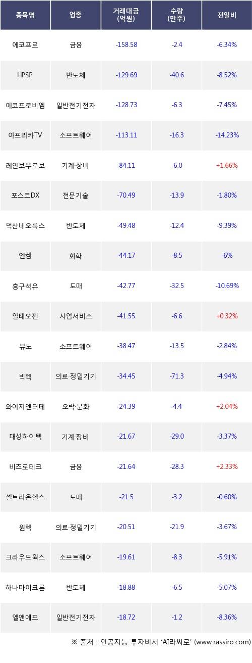 외국인 투자자의 순매도 상위 20개 종목은 에코프로, HPSP, 에코프로비엠, 아프리카TV, 레인보우로보틱스, 포스코DX, 덕산네오룩스, 엔켐, 흥구석유, 알테오젠등이다.