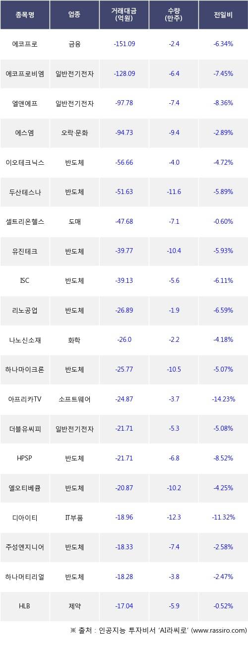 기관 투자자의 순매도 상위 20개 종목은 에코프로, 에코프로비엠, 엘앤에프, 에스엠, 이오테크닉스, 두산테스나, 셀트리온헬스케어, 유진테크, ISC, 리노공업등이다.