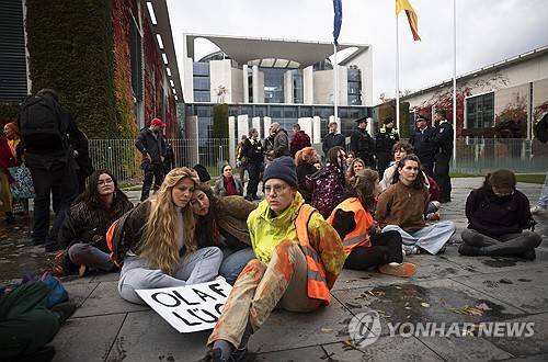 Activist of the 'Letzte Generation' (Last Generation) sit in front of the chancellery after being arrested by the police after they tried to paint slogans in the front of the chancellery during a climate protest against the government's climate policy in Berlin, Germany, Tuesday, Oct. 31, 2023. (AP Photo/Markus Schreiber)