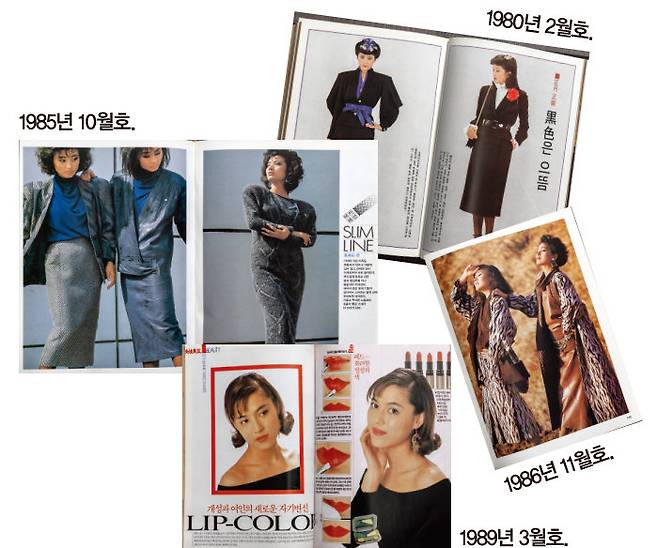 당시 패션 트렌드는 담당 기자의 캡션으로 단번에 파악할 수 있다. '지성적 이미지를 연출하는 전형적인 아이비(차림), 체크무늬 니트와 코팅 처리된 넉넉한 바지’ '점퍼 스타일의 진 차림과 같은 톤의 언더셔츠’ 등 1980년대를 대표하는 니트와 진을 적극 활용한 모습이다. 여기에 빈티지한 체크 패턴, 브라운 톤이 곳곳에서 넘실대며 낭만적이고 자유로웠던 그 시절을 재현해냈다.
