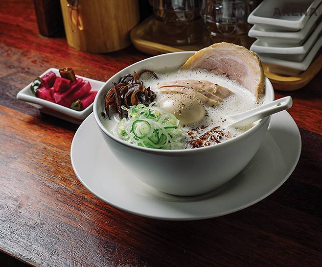 육수는 이틀에 걸쳐서 낸다. 사골, 등뼈, 족, 머리뼈 같은 각종 돼지 뼈를 1차로 끓인 뒤, 또 새로운 뼈와 돼지 살코기를 넣고 2차로 끓인다. 이 작업만 21시간 남짓 걸린다. 곁들이는 조미료도 남다르다. “그린 카다멈, 코리앤더 시드 등 8가지 향신료를 볶아 만든 마살라를 곁들여 먹으면 또 다른 맛이 나요.” 과연 자신을 ‘커리 출신’이라고 주장할 만한 팁이다.
