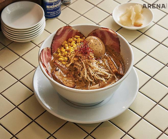 “특선 미소 라멘은 일반 미소 라멘에 닭과 돼지 목살 차슈를 추가한 구성이에요. 매일 아침에 직접 썰어요. 달걀도 한 알 통으로 올리고요.” 라멘을 주문하면 가장 먼저 숙주를 볶는다. 돼지와 닭, 해산물을 섞어 만든 진한 육수에 숙주와 튀긴 양파 부스러기를 넣어 아삭한 식감을 살리고 옥수수를 얹어 달큰한 맛도 냈다. “삿포로에서는 라멘에 옥수수를 넣는 것이 일반적이거든요.”