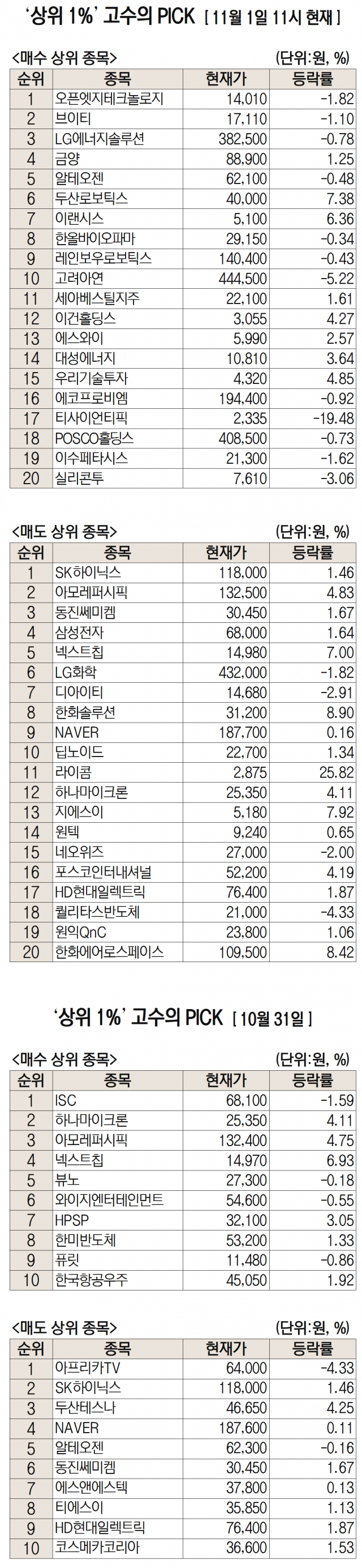 미래에셋증권은 자사 고객 중에서 지난 1개월간 수익률 상위 1% 투자자들의 매매 종목을 집계해 실시간·전일·최근 5일 기준으로 모바일트레이딩시스템(MTS)상에서 공개하고 있다. 이 통계 데이터는 미래에셋증권의 의견과 무관한 단순 정보 안내이며, 각각의 투자자 개인에게 맞는 투자 또는 수익 달성을 보장하지 않는다. 또 테마주 관련종목은 이상급등락 가능성이 있으므로 유의해야 한다.