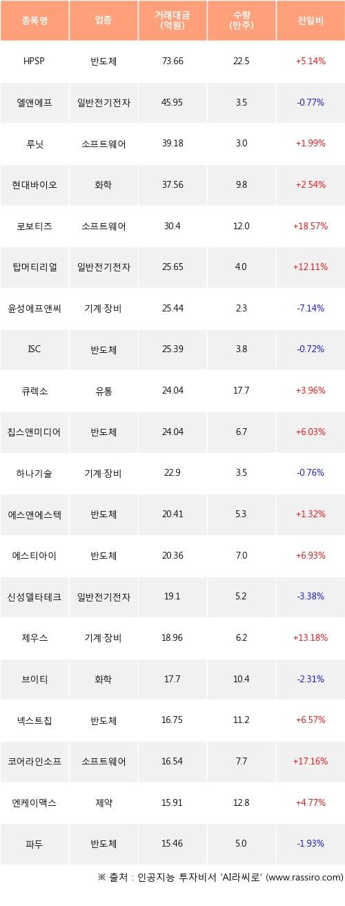 외국인 투자자의 순매수 상위 20개 종목은 HPSP, 엘앤에프, 루닛, 현대바이오, 로보티즈, 탑머티리얼, 윤성에프앤씨, ISC, 큐렉소, 칩스앤미디어등이다.