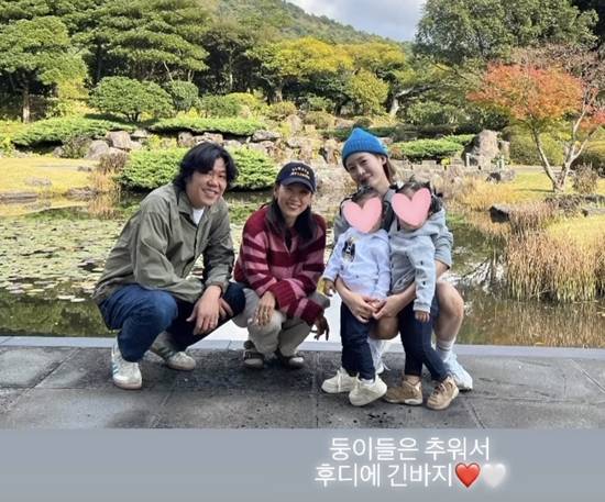 지난달 31일 성유리는 "후디에 반바지. 둥이들은 추워서 후디에 긴 바지"라는 글과 함께 사진을 게재했다.