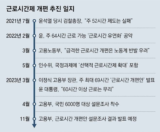 윤석열 대통령까지 나서 제도 보완을 지시해 고용부는 6월부터 두 달가량 일반 국민, 근로자, 사업주 등 6000명을 대상으로 설문조사를 실시했다. 근로시간제도 개편과 관련된 인식과 제도 현황 등이 주요 내용이었다. 이를 토대로 국민 의견을 수용해 제도 개편안을 보완하겠다는 것이다. 이성희 고용부 차관은 8월 동아일보와의 인터뷰에서 “근로시간 개편이 모든 업종, 직종에 똑같이 필요한 것은 아닌 것 같다”며 직종별, 업종별 차등 적용 가능성을 시사했다. 고용부는 조만간 이번 설문 결과와 함께 개선 방향을 발표하고, 다양한 의견 수렴을 거쳐 구체적인 제도 개편안을 다시 마련할 계획이다.