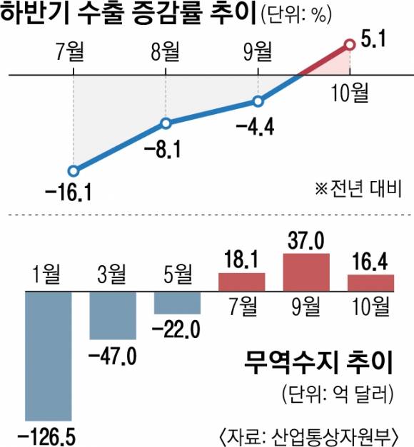 1일 산업통상자원부가 발표한 수출입 동향에 따르면 10월 수출은 550억 9000만 달러로 전년보다 5.1% 증가했고, 수입은 534억 6000만 달러로 9.7% 감소해 16억 4000만 달러의 무역수지 흑자를 기록했다. 지난 6~9월에는 수출보다 수입이 더 줄어 흑자가 나는 ‘불황형 흑자’ 꼬리표가 따라다녔다.