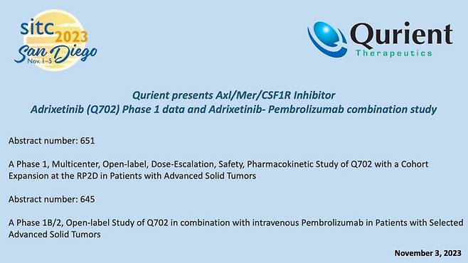 큐리언트는 오는 3일(현지시간) 미국 샌디에이고에서 열리는 '2023 미국면역항암학회'(SITC)에서 면역항암제 아드릭세티닙(Q702)의 임상 1상 데이터를 발표하고, 머크(MSD)와 공동개발 중인 키트루다 병용 임상 스터디를 공개한다고 2일 밝혔다.