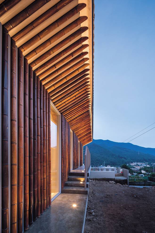 김해는 전통적인 대나무 산지로 부지 인근 상동면 무척산 일원에는 대규모 대나무 군락지가 위치하고 있다. 멀리서 바라보는 건물 역시 외관이 탄화된 대나무로 둘러싸여 대나무 숲을 연상시켰다. 콘크리트 외관에 대나무를 고정했는데 질감이 거칠고 무채색인 콘크리트 벽돌 사이로 이끼가 자라나면서 세월의 흔적까지 엿볼 수 있다는 게 이 대표의 설명이다.