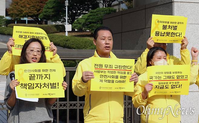 "혹시나 했는데 역시나다. 일말의 희망을 산산이 부수는 법원의 행태가 유가족의 한 사람으로서 비통하고 분노를 느낀다. 대한민국 사법부는 국민을 지켜주지 않는다. 가진 사람, 권력 있는 사람, 기득권 세력 편의만을 위한 사법부가 됐다. 2014년 4월 16일 침몰하는 세월호에서 304명이 억울하게 죽었는데 출동한 123정 정장 한 명만 처벌받고 아무도 처벌받지 않았다. 해경정장은 죄가 있고 승객구조에 책임이 있는 지휘부는 책임이 없다는 말인가. 이 말도 안 되는 판결을 누가 납득할 수 있나?"