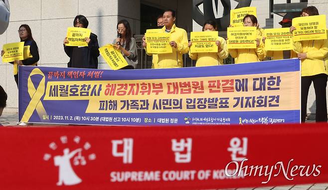 | ▲ 4.16세월호참사가족협의회와 4월16일의 약속 국민연대 관계자들이 2일 오전 서울 서초구 대법원 앞에서 기자회견을 열어 세월호 참사 해경 지휘부에 대한 대법원의 무죄 판결에 대해 ”국가가 국민의 생명과 안전을 지키지 않아도 국가는 어떠한 지시, 구조 계획을 세우지 않아도 생명이 무고하게 희생되어도 책임을 지지 않는다는 선례를 남겼다"며 "정부 책임자들과 해경 구조 세력 컨트롤타워에게 면죄부를 주는 판결을 했다"고 규탄하고 있다. |