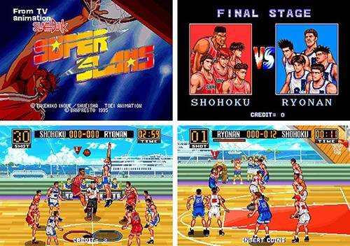검떠 : 슈퍼 슬램은 단순히 오락실에서 즐길 수 있었기 때문만이 아니라 뛰어난 완성도 덕분에 꾸준한 인기를 얻은 게임입니다. 게임을 시작하면 원작에 등장했던 북산, 상양, 능남, 해남대 부속 고등학교 중 한팀을 골라 시합을 즐길 수 있었는데요, 동작이 부드럽지는 않았지만 덩크의 호쾌한 손맛이 원작을 그대로 옮긴 듯 해서 즐기는 사람들이 많았습니다.