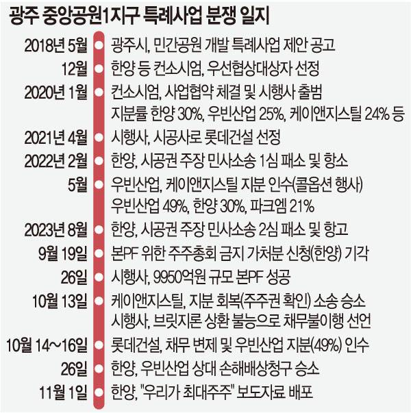 분쟁은 광주 중앙공원1지구 민간공원특례사업을 맡은 시행사(빛고을중앙공원개발)가 2021년 4월 롯데건설을 시공사로 선정하면서 시작됐다. 당초 시행사의 전신인 컨소시엄을 꾸려 2018년 광주시에 제안서를 제출한 건 한양이었다. 한양은 시공사를 맡기로 하고 사업을 추진한 것이었기 때문에 롯데건설 영입으로 ‘낙동갈 오리알’이 된 셈이었다.