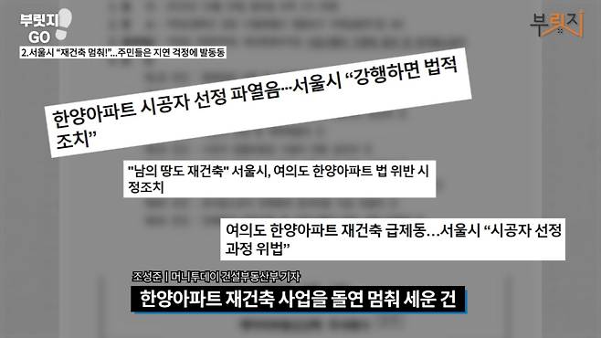 하지만 운영위원회와 KB부동산신탁은 지난달 19일 시공사 선정 총회의 취소를 공지했습니다. 한양아파트 재건축 사업을 돌연 멈춰 세운 건 서울시의 경고였죠. 시공사 선정 입찰 공고의 내용을 문제 삼았습니다.