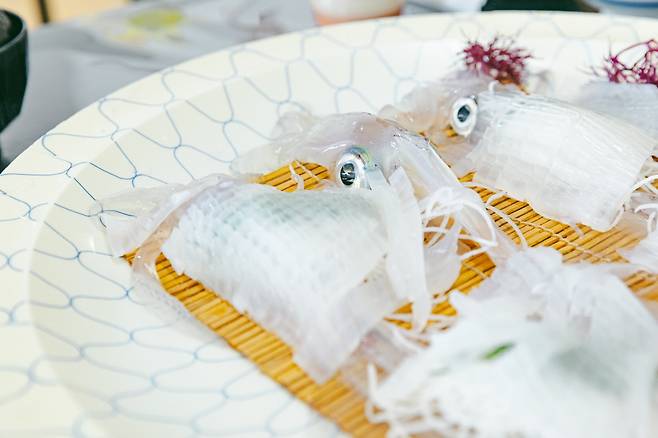 이제 점심 식사할 차례, 웬만하면 오징어 회를 추천한다. 후쿠오카에 맛있는 음식이 많지만, 이 오징어 회만큼은 가라쓰 요부코에서 잡히는 오징어가 으뜸이다. 일본 내에서도 유명한 오징어 산지이고, 멀리서도 맛보러 올 정도다. 당일에 잡은 오징어는 유달리 투명하다. 탱글탱글한 식감과 최상의 단맛을 자랑해 한 마리로는 아쉬울 정도다. 회를 먹고 즐기는 오징어 튀김과 곁들임으로 나오는 오징어 슈마이(만두)도 만족감을 더한다.