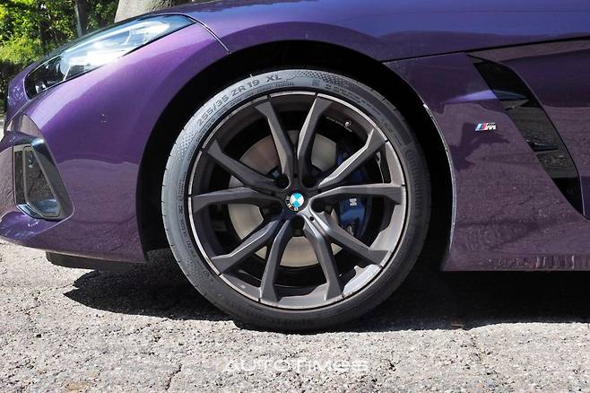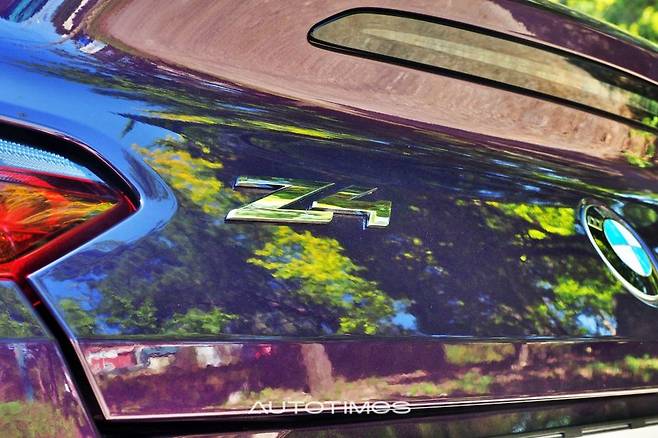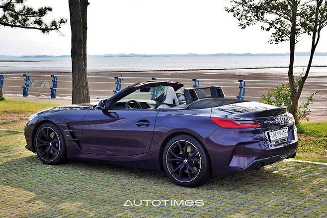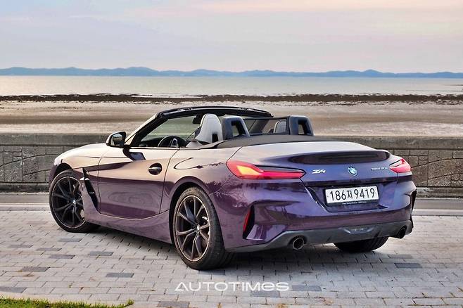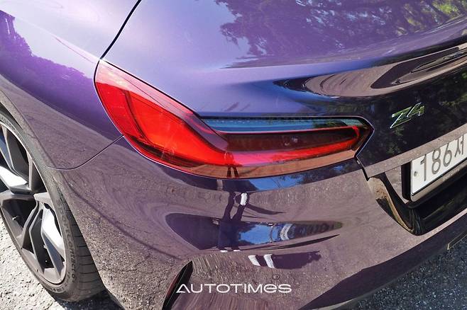 뒤는 굴곡진 가로형 테일램프가 보라빛 컬러와 어우러져 매혹적인 눈빛으로 유혹한다. 차가 더 넓어 보이는 효과도 동시에 안겨준다. 윈드 디플렉터와 접힌 소프트톱, 트렁크 비율도 매우 좋다. 심지어 트렁크는 끝을 올려 일체형 스포일러 역할도 대체한다. 투톤으로 처리한 디퓨저와 듀얼 배기구, 멋있고 두툼한 'Z4' 배지는 뒤태의 방점을 찍는다.